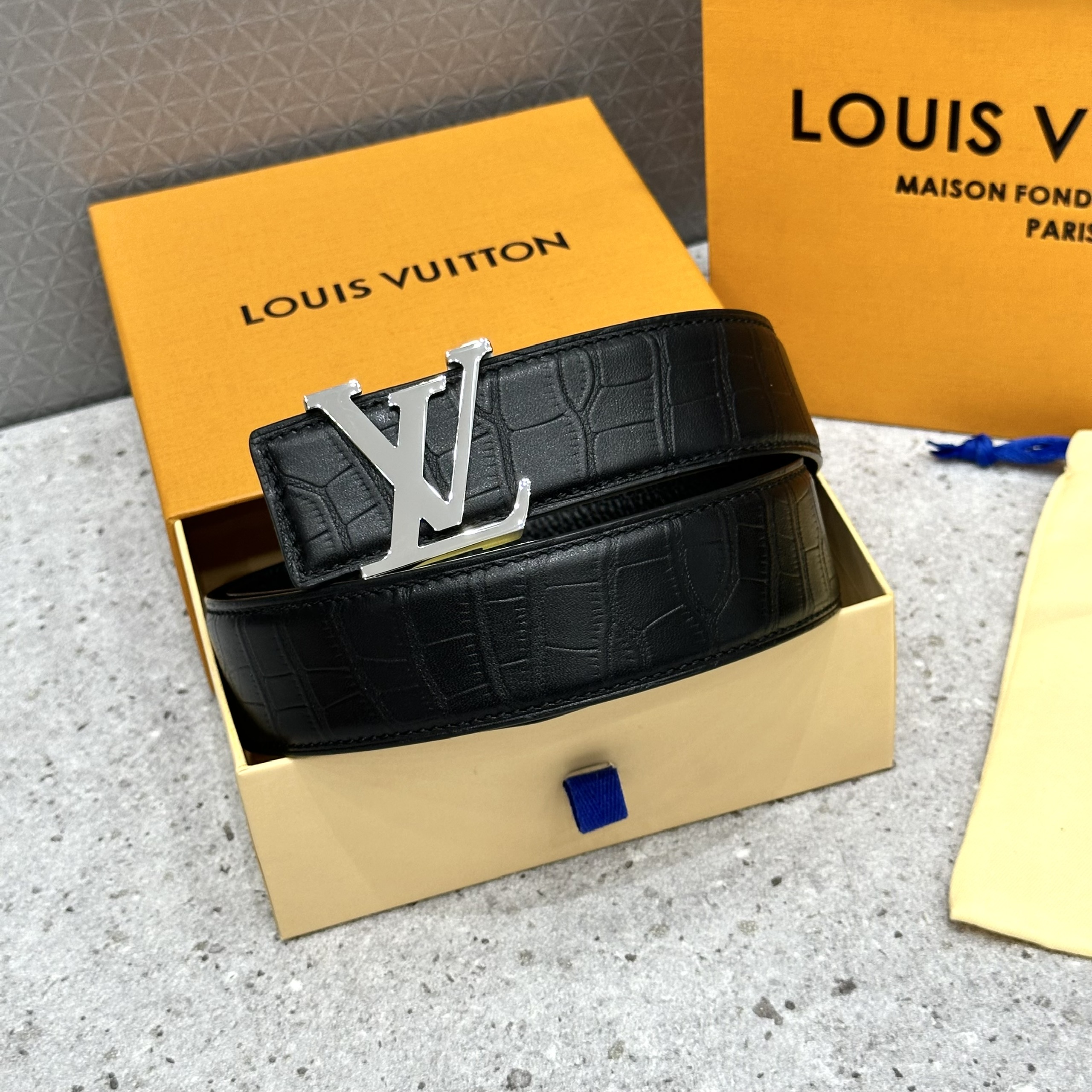 Black LV Belt with Deep Fish Skin Pattern LV Silver Letter Face ?C Super Class
